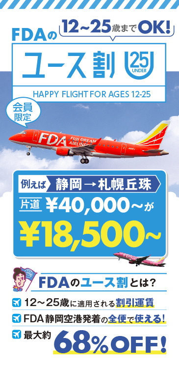 - 『ユース割』は、満12歳以上25歳以下のお客様ご本人および同行5名までご利用いただけます。ご搭乗手続きの際、年齢を証明する公的書類をご提示ください。